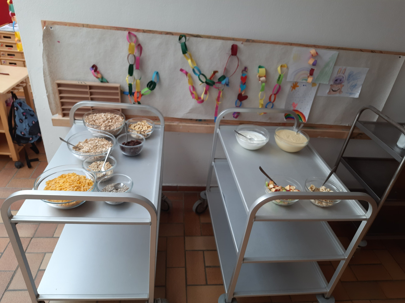 Die Kinder haben die Möglichkeit, ihr Müsli selbst zusammenzustellen. Dafür stehen ihnen verschiedene Zutaten wie Haferflocken, Obst, Nüsse, Samen und Milchprodukte zur Verfügung.
